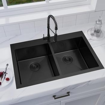 Fregadero de acero inoxidable PVD negro Fregadero de cocina de doble cuenco de 33x22 pulgadas con dos agujeros de calibre 16